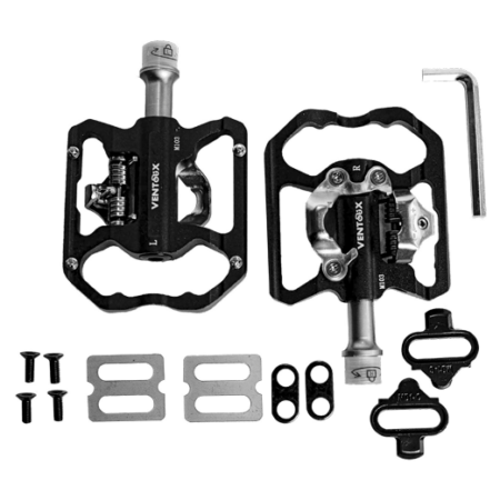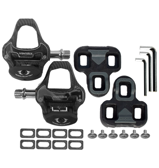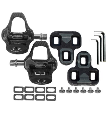 Pedales de ruta Ventoux fabricados en titanio, ideales para uso en ruta por su ligereza y resistencia. Compatibles con calas sistema Look, ofrecen una fijación segura y eficiente. Incluyen par de pedales + calas.