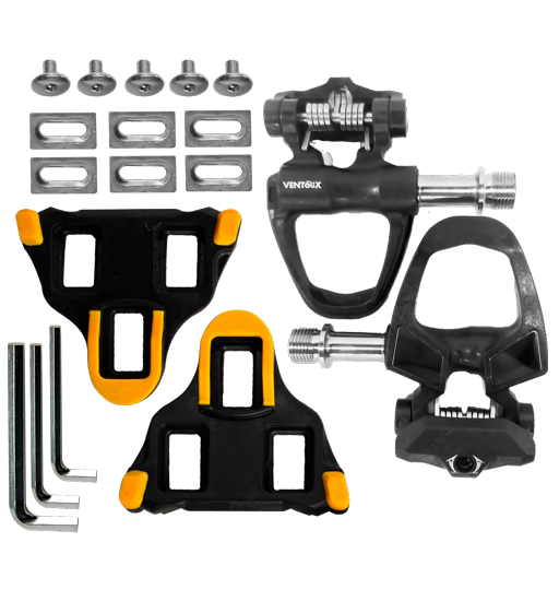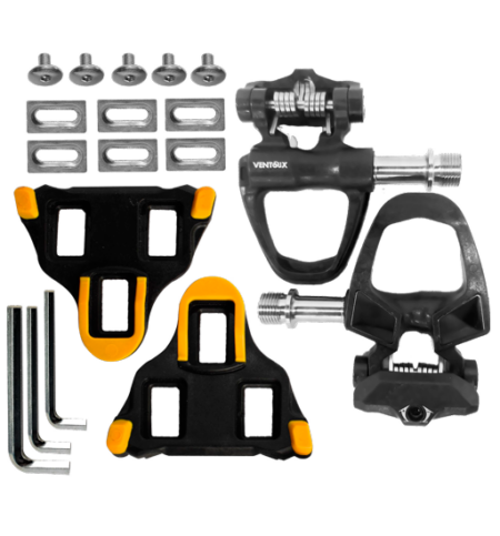 Pedales de ruta Ventoux en carbono, ideales para uso en ruta por su ligereza y alto rendimiento. Compatibles con calas sistema Shimano, ofrecen una fijación segura y eficiente. Incluyen par de pedales + calas.