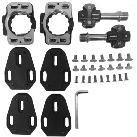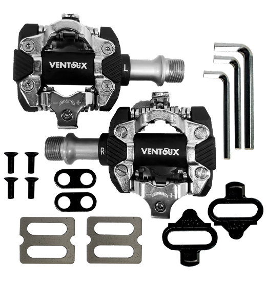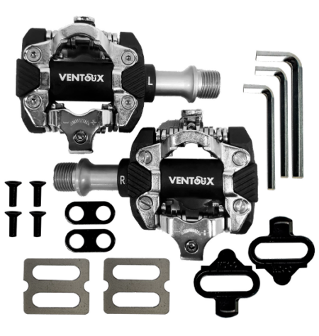 Pedales Ventoux para MTB con elegante apariencia tipo carbón, diseñados para brindar resistencia, estabilidad y mejor transmisión de potencia. Compatibles con calas e incluyen el par de pedales + calas, ideales para un pedaleo más seguro y eficiente en cada ruta.
