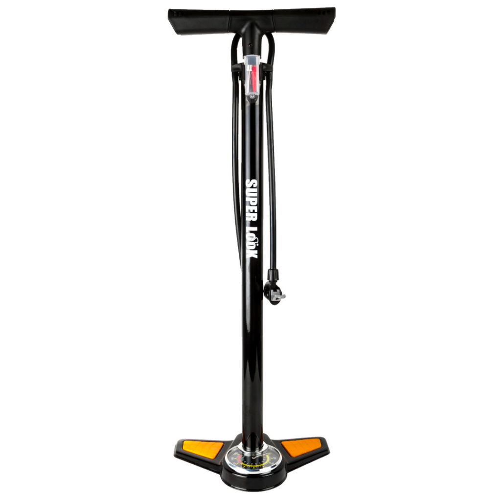 Inflador de piso SUPERLOOK SL5328 fabricado en aluminio resistente, ideal para un inflado rápido y eficiente. Su diseño en color negro combina durabilidad y estilo, alcanzando hasta 140 PSI, perfecto para bicicletas y uso diario con máxima presión y precisión.